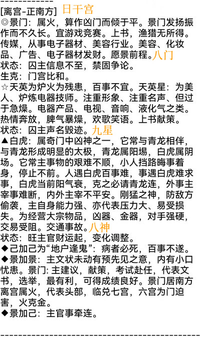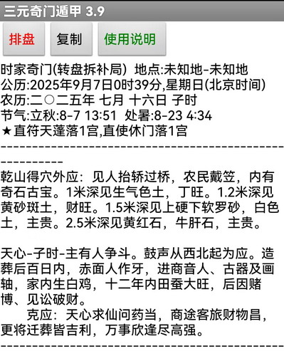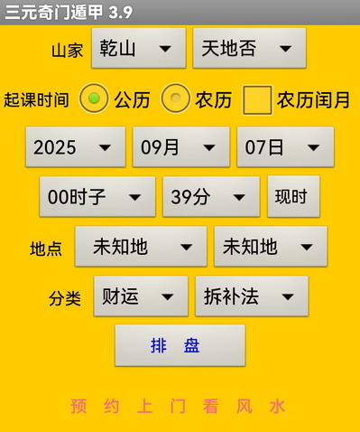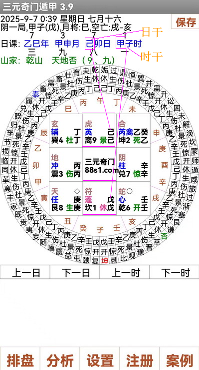 【三元奇门奇遁甲】用法非常简单,输入坐山卦和日课,排盘后直接看坐山卦所在宫位断事就行,坐山卦遁得三奇乙丙丁和三吉门开门生门休门为大吉;点【分析】就看到解释了。好比是【观音签】,问什么看什么就行,问财看财,问婚姻看婚姻就行,不相关的不用看。有时参看一下向上宫位的信息就好,不用花一万多的学费去学奇门遁甲。