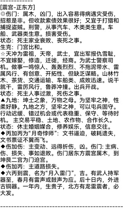 门迫:门的五行克宫的五行,如开门(五行属金)落震宫(五行属木),主阻力重重,有志难伸,事情有阻碍,不顺利,伤灾,破财。此事将来要落空、空忙活一场。