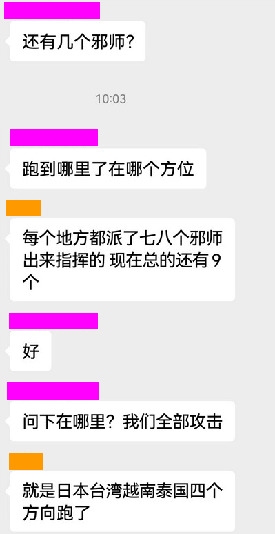 查到泰国邪师在江门地区放毒蚊子害人,还跑到清远来想放毒,即出兵把他们消灭,与学员合力大战鬼子邪师,合力破解了江门地区的邪法。
